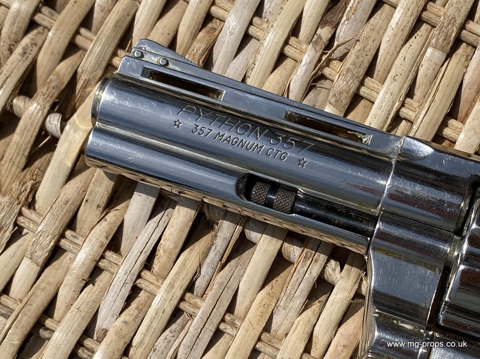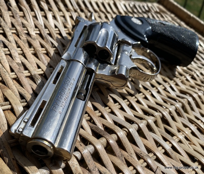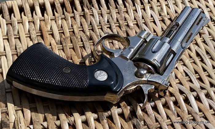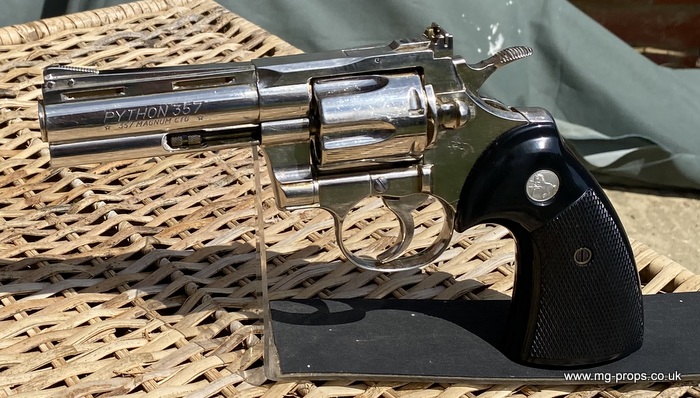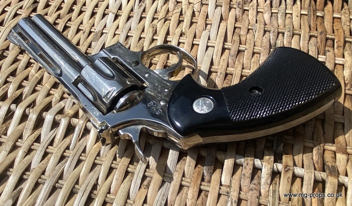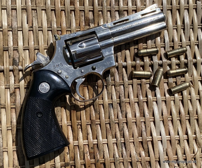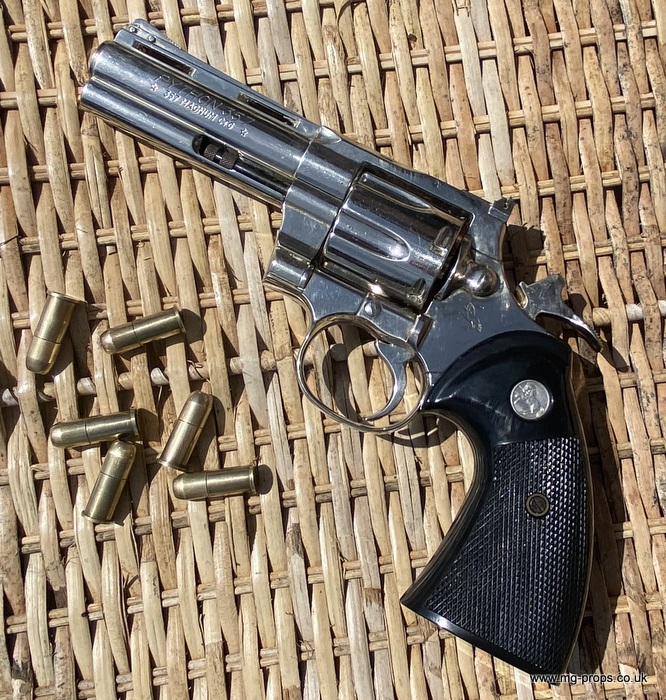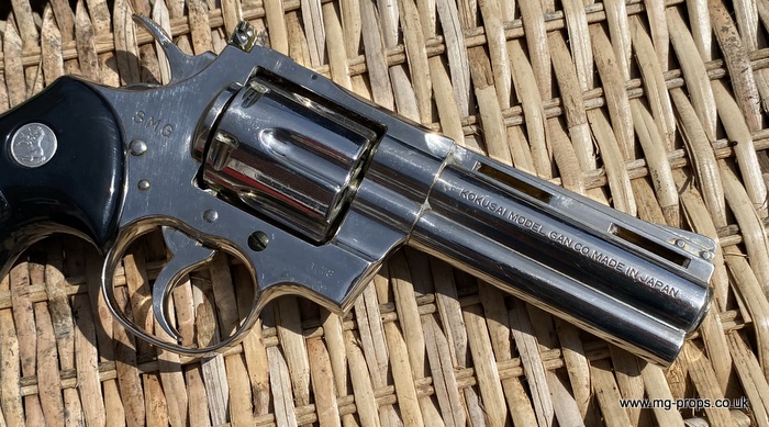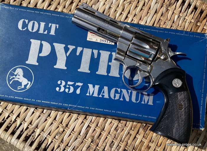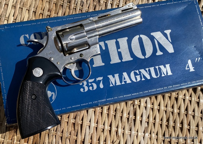 Made January 1978 and in very good condition for year Appears unfired with 6x unfired / like new Kokusai .357 Magnum Firing Cartridges Includes original box, 6x Kokusai .357 firing cartridges (requires PFC primer cap for the bang). Weight : Approx: 895g (unloaded) Vents from cylinder 4 inch barrel version Photos above of actual revolver for sale Originally would have been gold which has been removed to reveal chrome silver finish We ship internationally. Please ask for a shipping quote: sales@mg-props.co.uk PFC Primer caps: £9.50 per box (1 box = 100 PFC caps) Lockable Aluminium Storage / Carry Case: £22.95