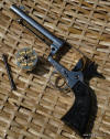€28.25 / £22.95 per box Colt S.A.A. .45 Real Look Dummy bullets Real look Colt .45 bullets with correct marking, great for display with your S.A.A. .45 : Six cartridges €33.25 / £22.95 Please ask about Wood Grips or Pearl Style Grips Brief info on: COLT S.A.A..45 Revolvers Colt SAA revolvers have been produced as Single Action Army and Buntline models . . . standard models have a round top frame . . . barrel lengths are 4 3/4, 5 1/2, and 7 1/2 inches. The Buntline model came with a 12 inch barrel but was otherwise similar to the regular SAA. The SAA uses a hammer mounted firing pin, and a loading gate in the left side of the frame gives access for loading and unloading. The steel ejector rod housing is located on the lower right side of the barrel, aligned with the loading gate. The fluted cylinder is easily removed for cleaning . . . and can be removed from the right side of the frame. To eject fired cases from a Colt single action revolver, the hammer is put in its half-cock position . . . the cylinder is manually rotated . . . so that a stroke of the spring loaded ejector rod can knock out the case. Loading is likewise accomplished one chamber at a time