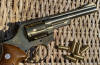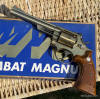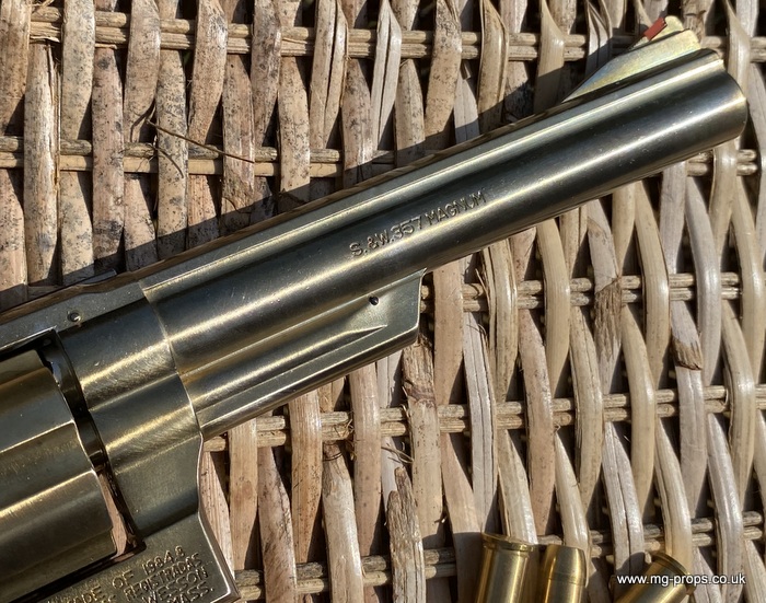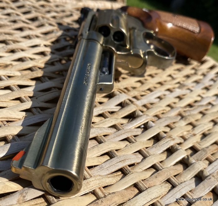 Metal Kokusai: Smith&Wesson M19 .357 COMBAT MAGNUM 6in barrel version Made mid 80's and in very good condition throughout, appears unfired !! Very rare in this condition Includes Original box, copy of original instructions, 6 Kokusai .357 Magnum cartridges (in new condition), Original gold colour, could be polished to a high chrome silver finish or blued Full S&W Markings Nice example and very heavy approx : 1.4 kilogram Vents from chamber 6 Inch barrel Photos above of the actual M19 .357 Magnum for sale We ship Internationally, please ask for shipping quote : sales@mg-props.co.uk