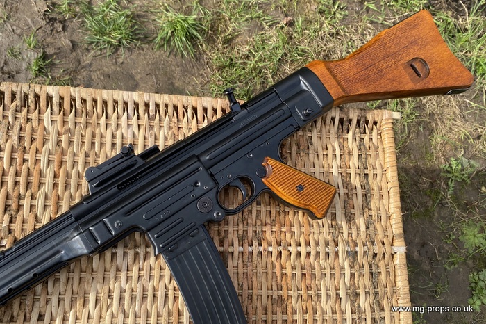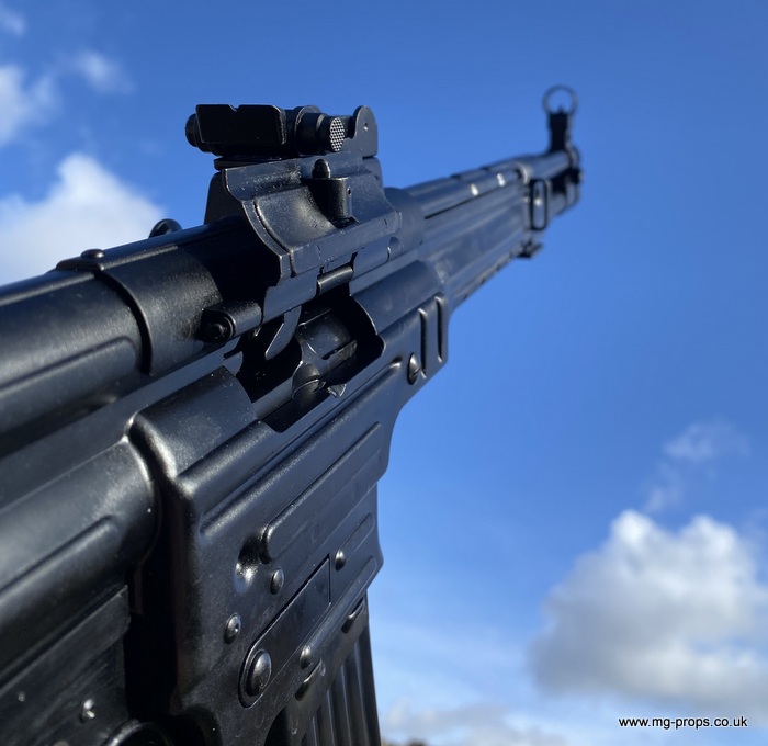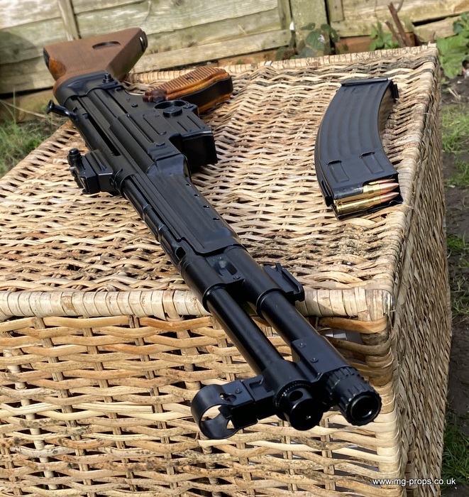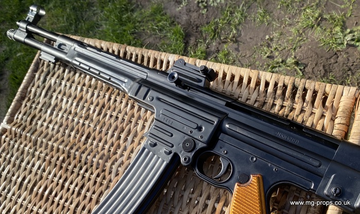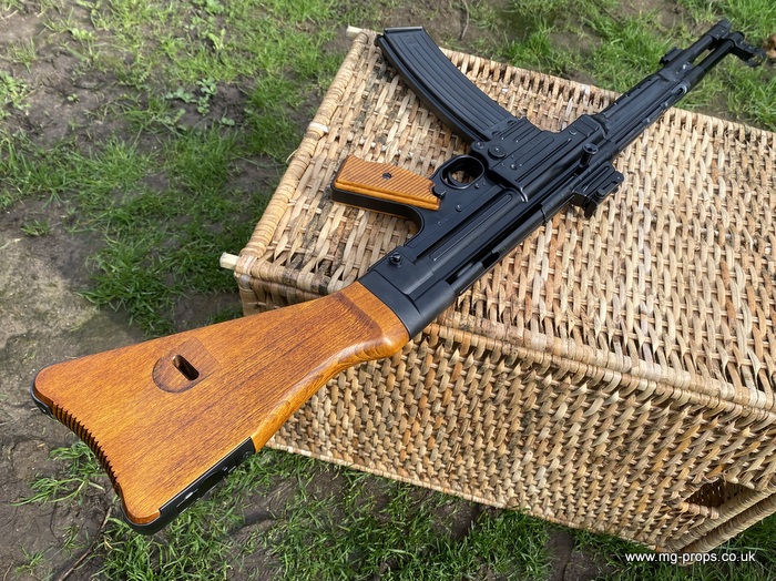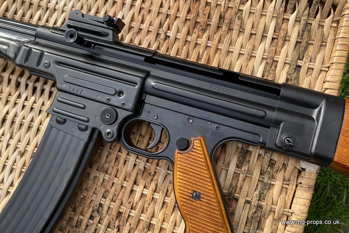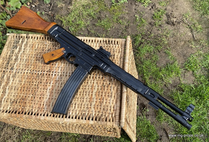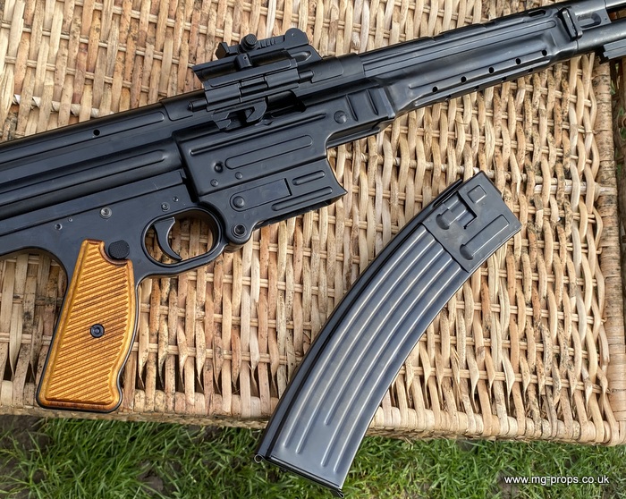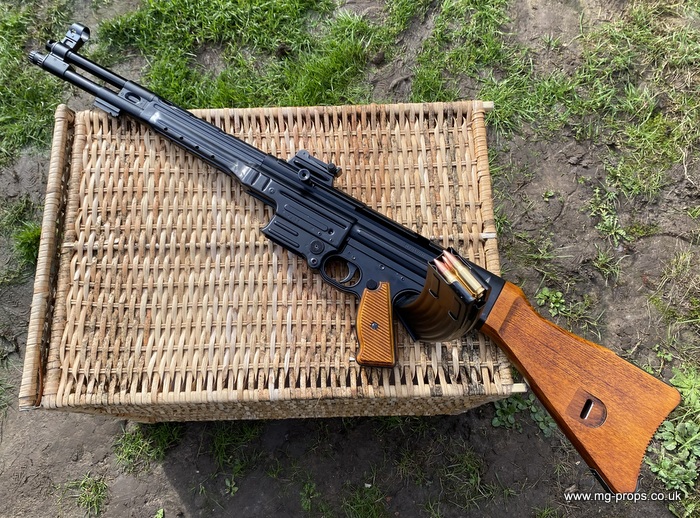 Extra cartridges and magazines available with sales or after sales. Superb quality, indistinguishable from the real thing, ideal for collectors, re-enactors, museum, living history, film or theatre We ship to internationally. Please ask for a shipping quote: sales@mg-props.co.uk Brief info on the Mkb42(H) This weapon, known as a worlds first assault rifle, was developed in Hitlers' Germany during the World War Two. Initial development took place under the designation of MKb.42 - MachinenKarabine, 1942. The experimental MKb's were developed by two German companies, Karl Walther (MKb.42(W)) and C.G.Haenel (MKb.42(H)). Both guns were intended as a replacement for submachine guns, bolt action rifles and, partly, light machineguns for front troops. Both guns were designed to fire intermediate (between rifle and pistol) cartridge, and have effective range of 600 meters or so. The 7.92mm Kurz cartridge, developed by Polte company, propelled 8.1 g (125 grains) bullet to roughly 680 meters per second. After initial trials the MKb.42(H), designed by Hugo Schmeisser, was found superior of two, and further development took place under the name of MP-43 (MachinenPistole, 1943, to avoid Hitlers opposition to made anything but SMGs). Some MP-43s were issued to troops at western front, and field reports were very promising. Final version appeared under the designation of Mp-44, and then Hitler finally approved it, but the new gun received also a new designation - SturmGevehr-44, which stands for no more than "Assault Rifle" in german language. This was pure act of propaganda, but the name stuck not only to that gun, but to the whole new class of automatic weapons, designed to fire intermediate cartridges. Total number of MP-43s, MP-44s and StG.44s produced was about 500 000, and these guns proved itself as very effective,