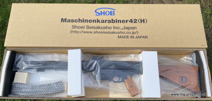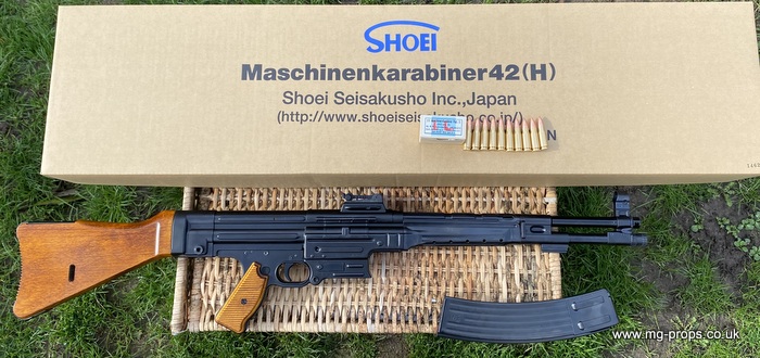 Limited production: Shoei : WWII German Maschinenkarabiner 42(H) Brand new. Very latest / last release. Very small production was released by Shoei. Shoei have sold out, we have a very limited supply in stock Each Shoei Mkb42(H) has its own unique serial number. This one is : 1462 as stamped on the receiver Very nicely detail with Waffenamt proof markings including on the carrier bolt (please see photos above) All metal with real wood furniture, Another absolute superb museum quality model gun from Shoei. Functions, fires, field strips exactly like the real thing Select fire like the real thing : Semi / Full Auto and working safety. Brand new includes: Original box /instructions, 10x Shoei 7.92mm Kurz real look / size dummy `bullets` that can be fully cycled and ejected and 30rd magazine, Everything on the Shoei Mkb42(H) operates exactly like it does on a real Mkb42(H) You can load the magazine, chamber and manually eject the real size/look dummy bullets. Bayonet lug (real bayonet fits the Shoei Mkb42(H) Weight: 5.2 Kilograms : Real thing 5.2 Kilograms Spare Magazines : £59.95 each Shoei : Mkb42(H) magazine Shoei 7.92mm Kurz Real look/ Size Dummy Bullets (5) (brand new) : £28.95