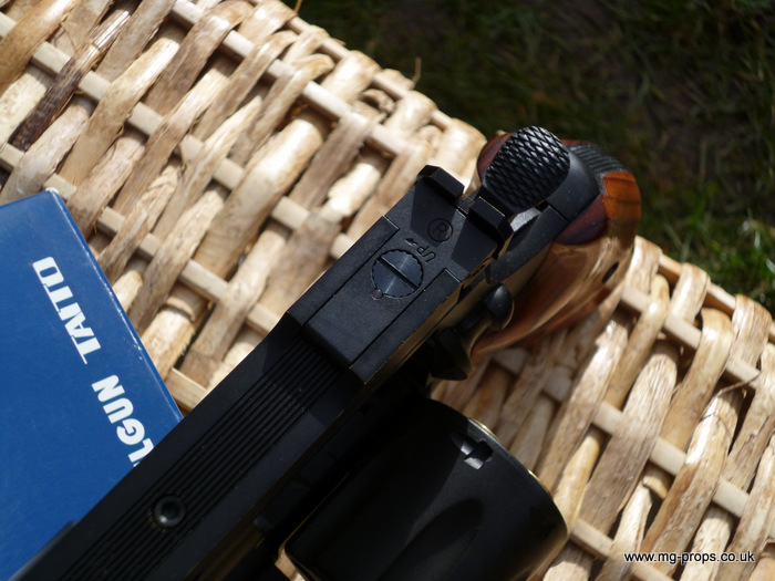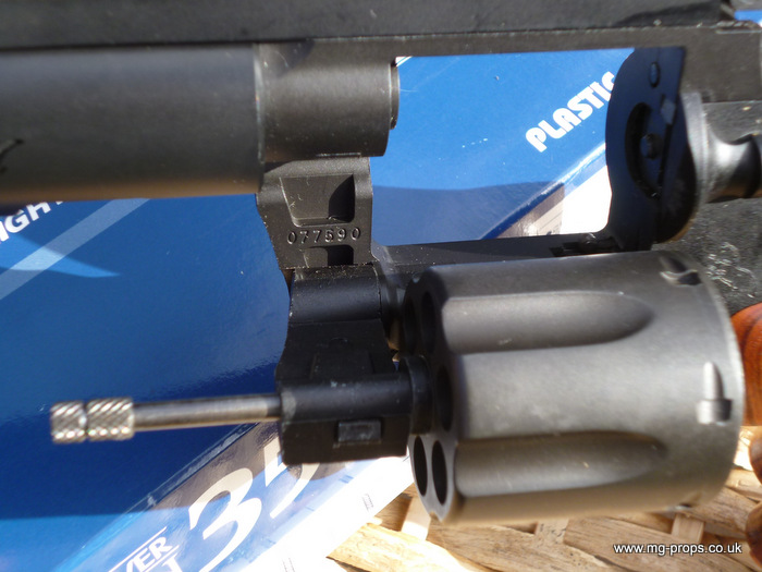 In new condition, unused / unfired, Made in the 90's. Super Black - Heavyweight version with real wood grips Includes Original box, six MGC .357 Magnum firing cartridges (takes 7mm PFC primer caps / not included), original instructions Weight Approx. : 1kg (1.1Kg loaded) Barrel Length: 6in Construction: Heavyweight Abs and metal parts Open barrel for venting sparks and smoke A beast of a revolver....Superb! We ship Internationally, please ask for shipping quote : sales@mg-props.co.uk