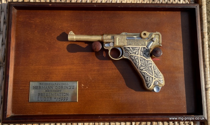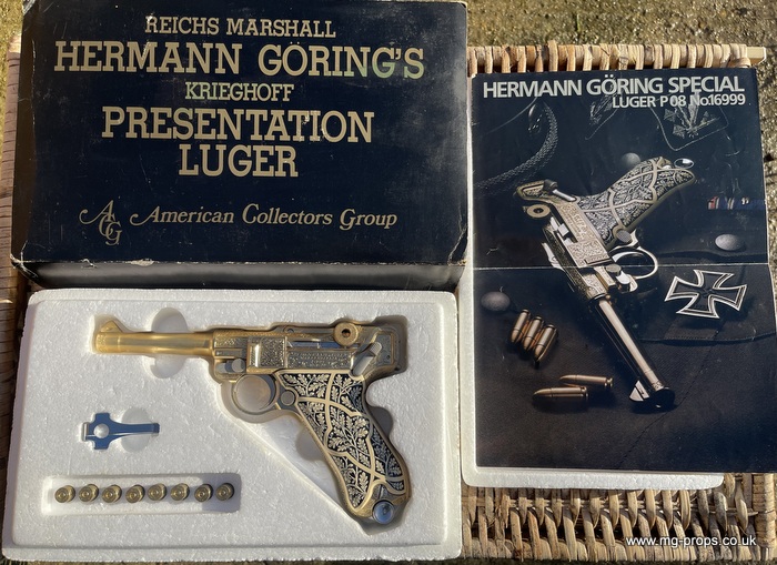 All metal and engraved like the original, looks stunning!! Gold finish like the original with serial number 16999 and proof marked ! Dummy bullet version. All moving parts, removable magazine, cycles and ejects 9mm dummy metal bullets (eight included) Functions, Field-strips like the real thing Barrel Length: 4in In very good condition. Includes original box, original instructions, 8x 9mm dummy bullets. Display Hanging Board with Plaque: £28.95