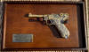 All metal and engraved like the original, looks stunning!! Gold finish like the original with serial number 16999 and proof marked ! Dummy bullet version. All moving parts, removable magazine, cycles and ejects 9mm dummy metal bullets (eight included) Functions, Field-strips like the real thing Barrel Length: 4in In very good condition. Includes original box, original instructions, 8x 9mm dummy bullets and wood display hanging plaque Optional : Eight real look / size 9mm Dummy Bullets: £21.95
