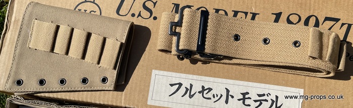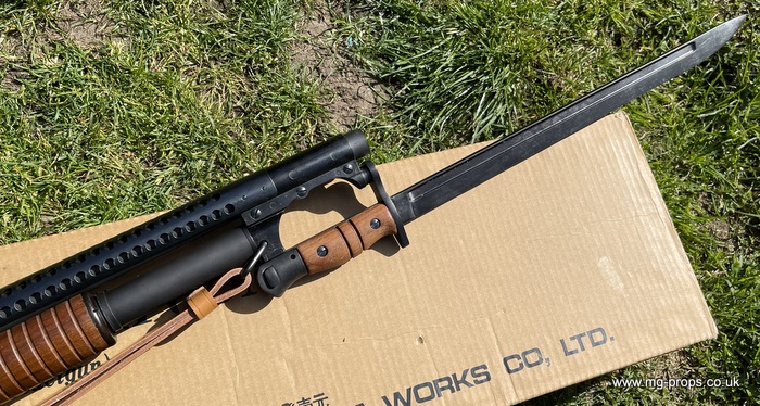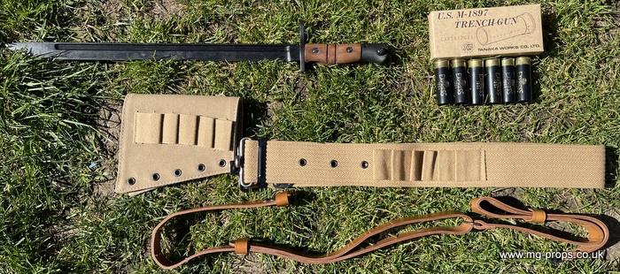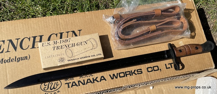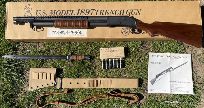 Rare Full Set Version includes: Tanaka Works M1897 Bayonet, M1897 Leather Carry Sling, 1x Box(6) 12G Firing Cartridges (reusable), Tactical Gun Belt (holds 12 rounds), Tactical Butt-Stock Holder (Holds 5 rounds) Also includes original box and original instructions. All items in excellent condition! Made in the 1990's and practically in new condition / unused / unfired. Photos above of actual M1897 Full Set for sale. Just one available....Be quick! The Tanaka M1897 functions and field-strips like the real U.S. M1897, with genuine wood stock and fore-grip and bayonet fixing Construction: Real wood stock, fore-grip, Heavyweight abs and metal parts Field strippable Weight Approx: 2.6Kg Length: 39 Inches Barrel Length: 19 1/2 Inches Open Barrel for venting Capacity: 6 Cartridge Power: 2x 7mm PFC primer caps We ship internationally, any questions please fire away ! : sales@mg-props.co.uk