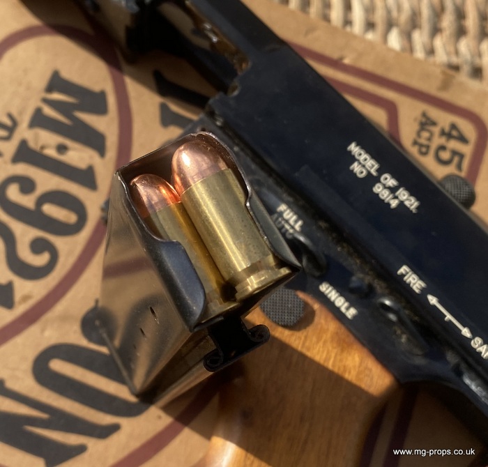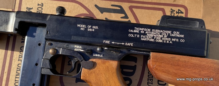 Extremely rare MGC Thompson 1921 Custom. Made August 1978 - Limited Edition Model and believed to be one of 150 made. This one is in excellent condition both externally and internally. Unfired ! Carrier bolt in excellent new condition Each Thompson had its own unique serial number. This one is : 9814 All works exactly as it should (semi / full auto / safety) Photos above of actual Thompson for sale Includes: Original box (a little tatty), copy of original instructions, 20rd stick magazine, 5x Brand .45ACP Dummy Bullets This originally fires the open cartridge (Paper Cap) cartridges which are now obsolete. We do have a brand new (CP) 7mm Cap system which is also open cartridge system so a very retro latest system enabling the Thompson to be fired with the latest PFC Primer Caps. Fully tuned by our expert team for very good consistent firing. Fully constructed of metal and wood, there is no plastic whatsoever anywhere. The Thompson will operate exactly like the real thing in every way, such as :Knurled Actuator Knob (cocking handle). safety selector, selectable fire: single and Full auto, loading, ejection of rounds, magazine loading/ removal, locking ,adjustable lift up sights, ect. Functions exactly like the real thing! This is a very hefty, weighs in around 4.4Kg and that is unloaded!! Functions Fires (Semi & Full auto), Exactly like the real thing! A rare chance to acquire the very rare MGC Thompson Custom Fully tuned / oiled by ourselves for superb full auto action as seen in our video above We ship internationally. Please email for a shipping quote: sales@mg-props.co.uk