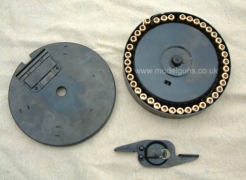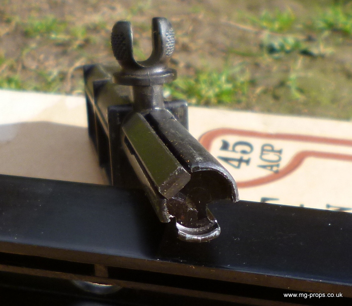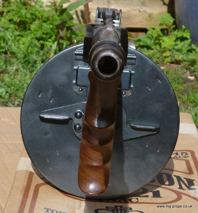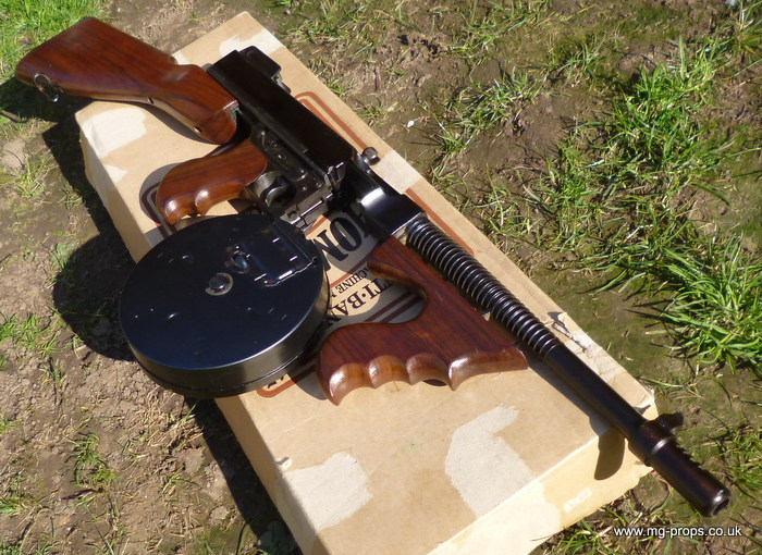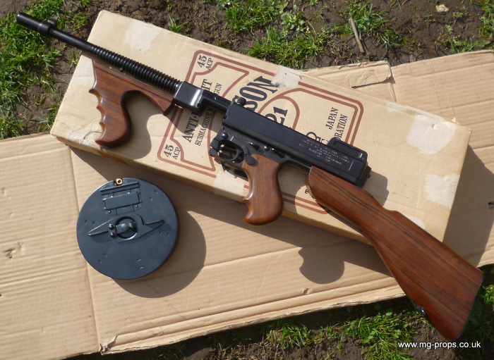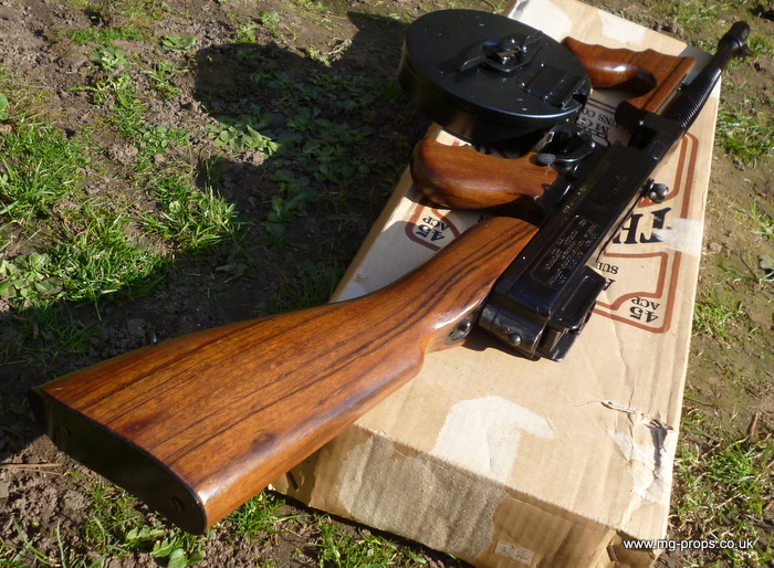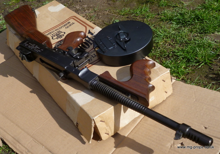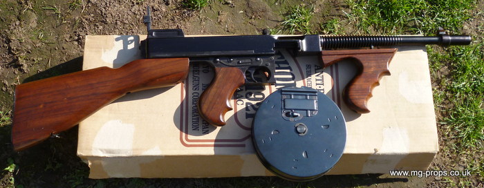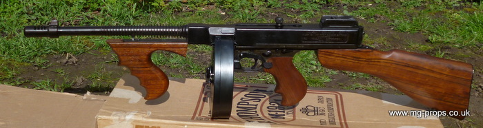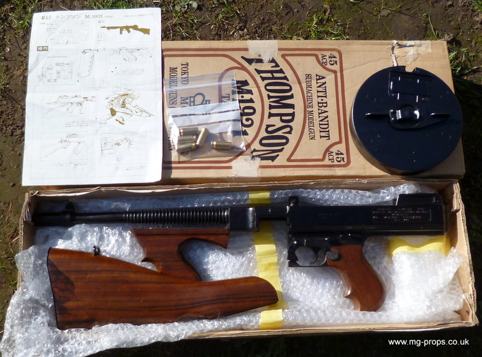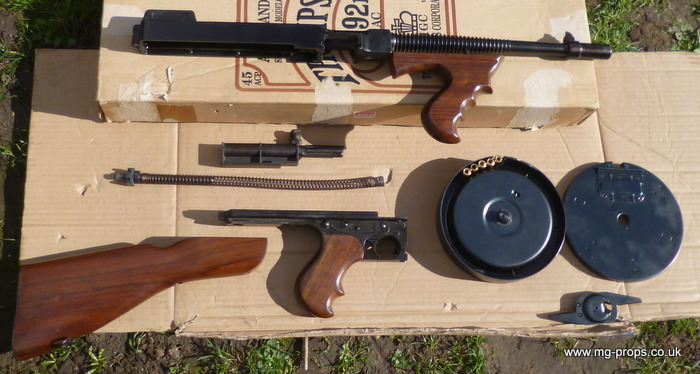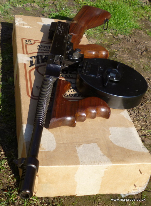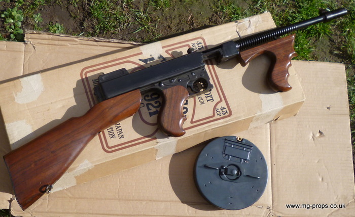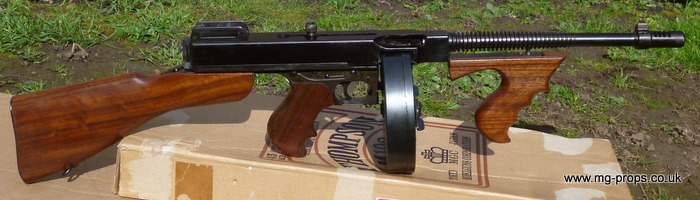 Made December 1995 and in very good condition and in unfired condition !! Rare Limited Edition Rose Wood version - Photos above of actual Tommy Gun for sale. Appears unfired and in almost new condition internally! Externally in very good condition (just a few very minor scuff / handling marks) Includes: Original MGC Thompson box (a little scruffy), 5x Brand new MGC .45ACP reusable blowback cartridges, MGC drum magazine (in excellent / unfired condition), original instructions. Fully constructed of metal and wood, there is no plastic whatsoever anywhere. The Thompson will operate exactly like the real thing in every way, such as :Knurled Actuator Knob (cocking handle). safety selector, selectable fire: single and Full auto, loading, ejection of rounds, magazine loading/ removal, locking ,adjustable lift up sights, ect. Functions exactly like the real thing! This is a very hefty, weighs in around 5.5Kg and that is unloaded!! Functions Fires (Semi & Full auto), Exactly like the real thing. Pre-tuned by our experts for superb semi and full auto firing ! ! Looks and feels superb. Be quick though as only one available. Check out the video above made by ourselves of one of these CHICAGO Thompson in action!! We ship internationally. Any questions : sales@mg-props.co.uk Full list of accessories below.