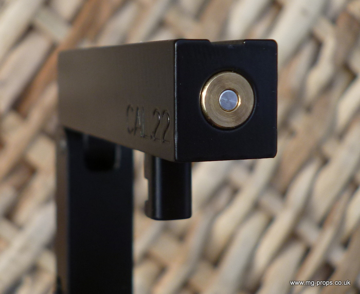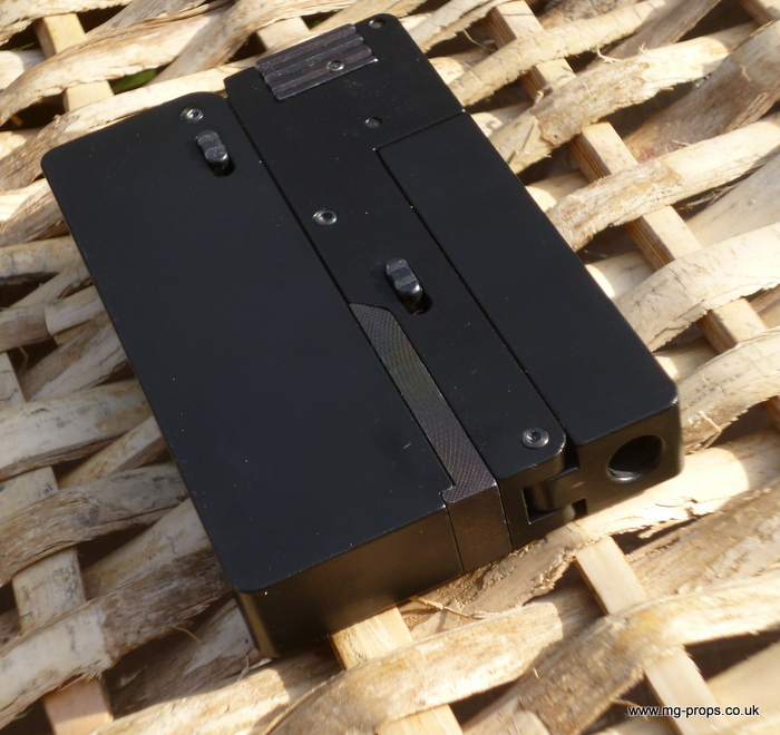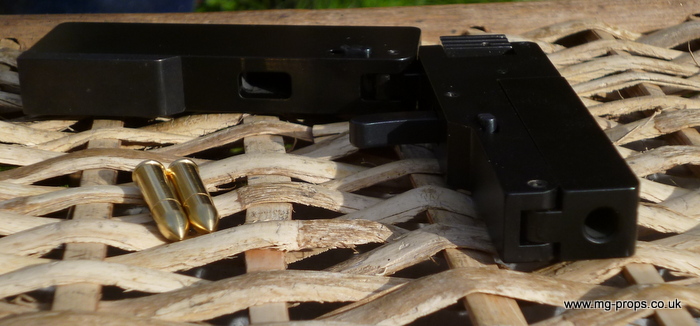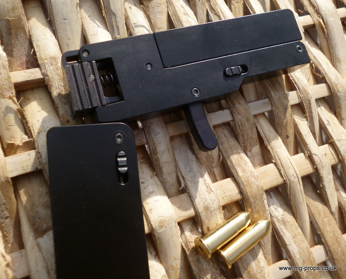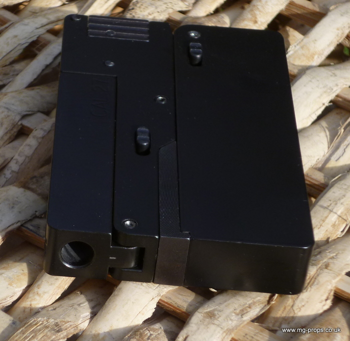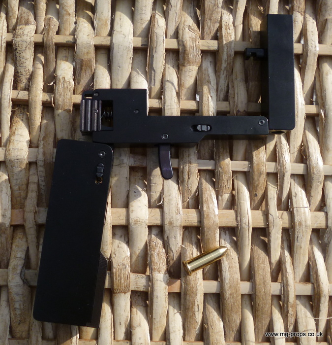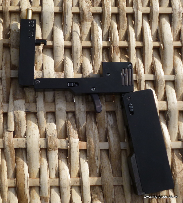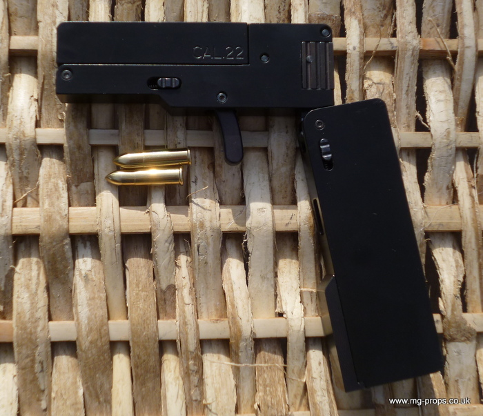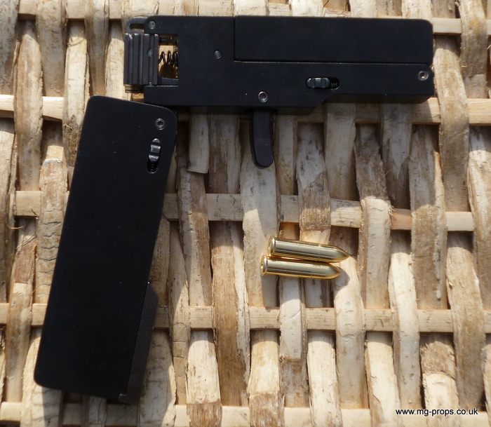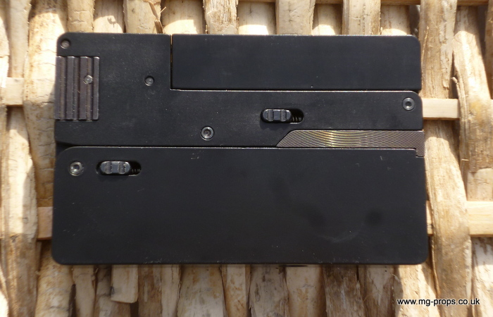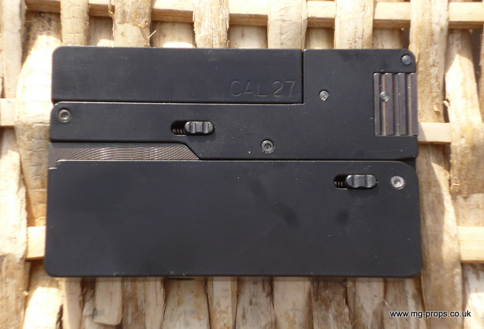 Cal.22 Very unique credit card size gun. Unfolds and and be loaded with a dummy bullet. Cocks and fires by squeezing the trigger. All metal. Weight : 415g Exact size of a credit card / thickness : 1/2 in Includes original box, instructions and 2x dummy bullets (either Cal.22 or Cal. 27) Any questions please email: sales@mg-props.co.uk We ship internationally. Please ask for a shipping quote