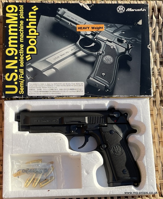 Marushin U.S.N. 9mm Beretta M9 Dolphin Semi/ Full Auto Heavyweight version This is the factory built version and Includes original box and 5x brand new / unfired Marushin 9mm blowback cartridges Heavyweight version weighing in unloaded at 755g. Has very nice weight and feel to it In very good condition / unfired Select Fire : Fires Semi Auto and Full Auto !
