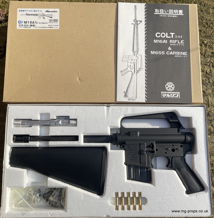 Photos of finish rifle can be seen here : Marushin Colt M16A1 Marushin: COLT M16A1 is a full size 1:1 scale metal blowback replica with over 170 parts. Highly detailed and weighs about the same as the original. This is an Official COLT Recognition replica pre 2000, not a cheap copy. Has all correct COLT markings and is virtually indistinguishable from the real thing. No makers name, just COLT. This is the self build version. Not the pre-built, modified and tuned version. For the modified/tuned built version please see here : Marushin M16A1 Tuned This is the later version by Marushin and in brand new condition, boxed with easy to follow visual instructions for self-build. Included 5x Marushin 5.56mm blowback cartridges.