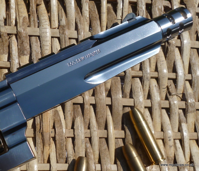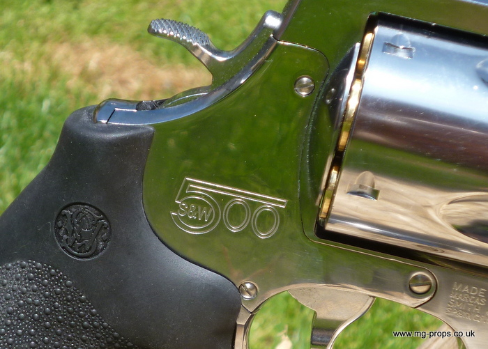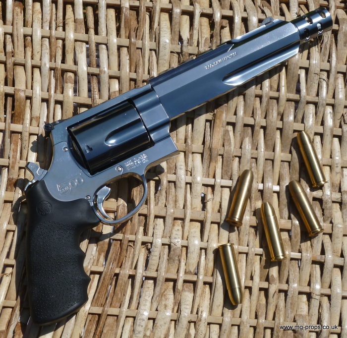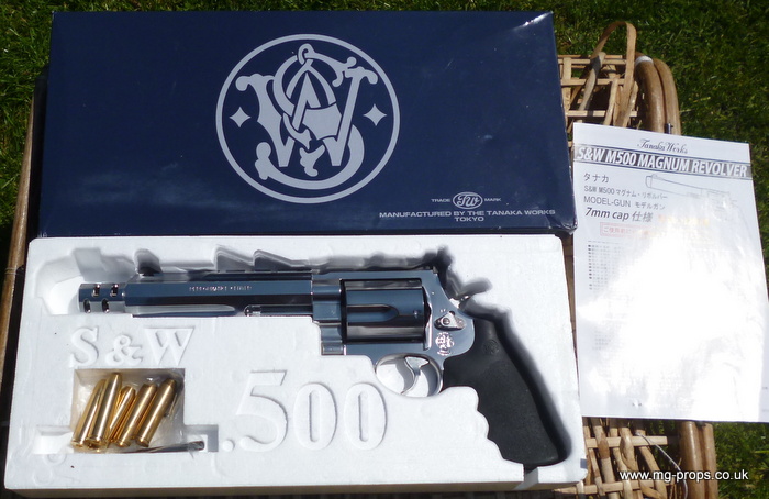 This is one big revolver!! Tanaka S&W M500 Performance Centre- Stainless Silver In very good condition, hardly used (almost new) Includes Original box, instructions, 5x Tanaka .500 Magnum centre fire, firing cartridges (reusable) (2x cartridges had very light use). Each cartridge takes 2x 7mm PFC Primer caps (PFC caps not included). Weight: Unloaded: 930g : Loaded: 1.18kg Constructions: heavyweight Abs and metal parts Picatinny Rail for fixing a Scope Adjustable rear sight Swing out cylinder Open barrel for venting smoke S&W markings and logo (no visible makers name / Tanaka Works) Hogue style rubber grips with S&W marking We ship internationally. Any questions please ask away: sales@mg-props.co.uk PFC Primer caps: £9.50 per box (1 box = 100 PFC caps) These are needed to make the bang and smoke!